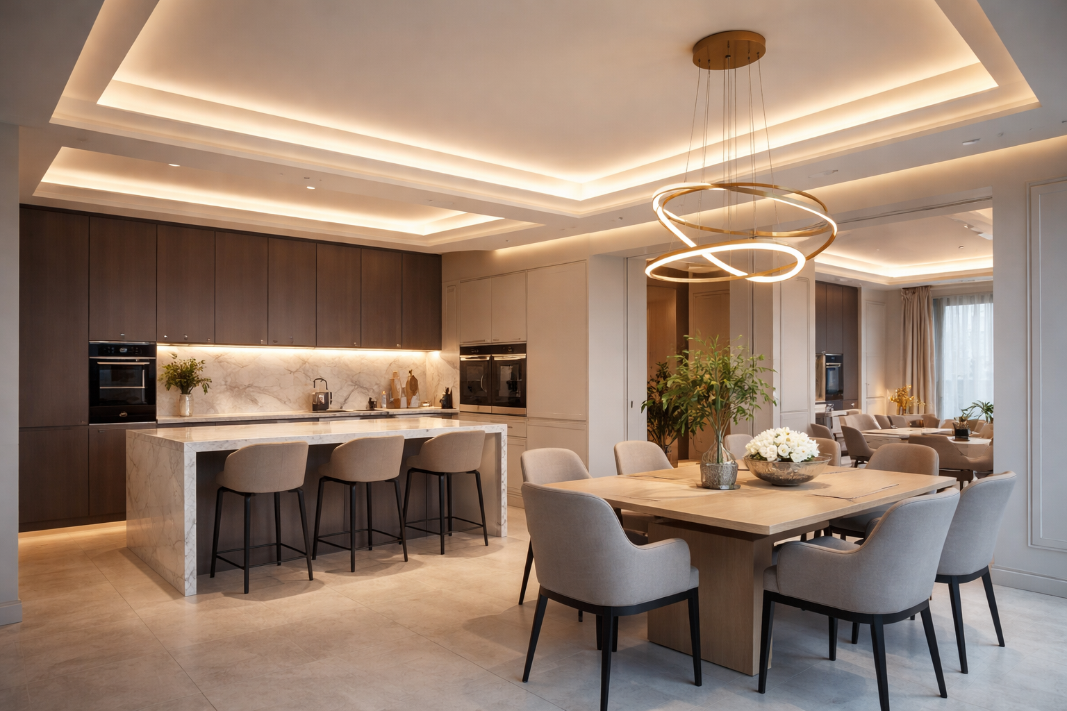 Moderne Design-Decken mit LED-Bänder oder Einbaustrahler.